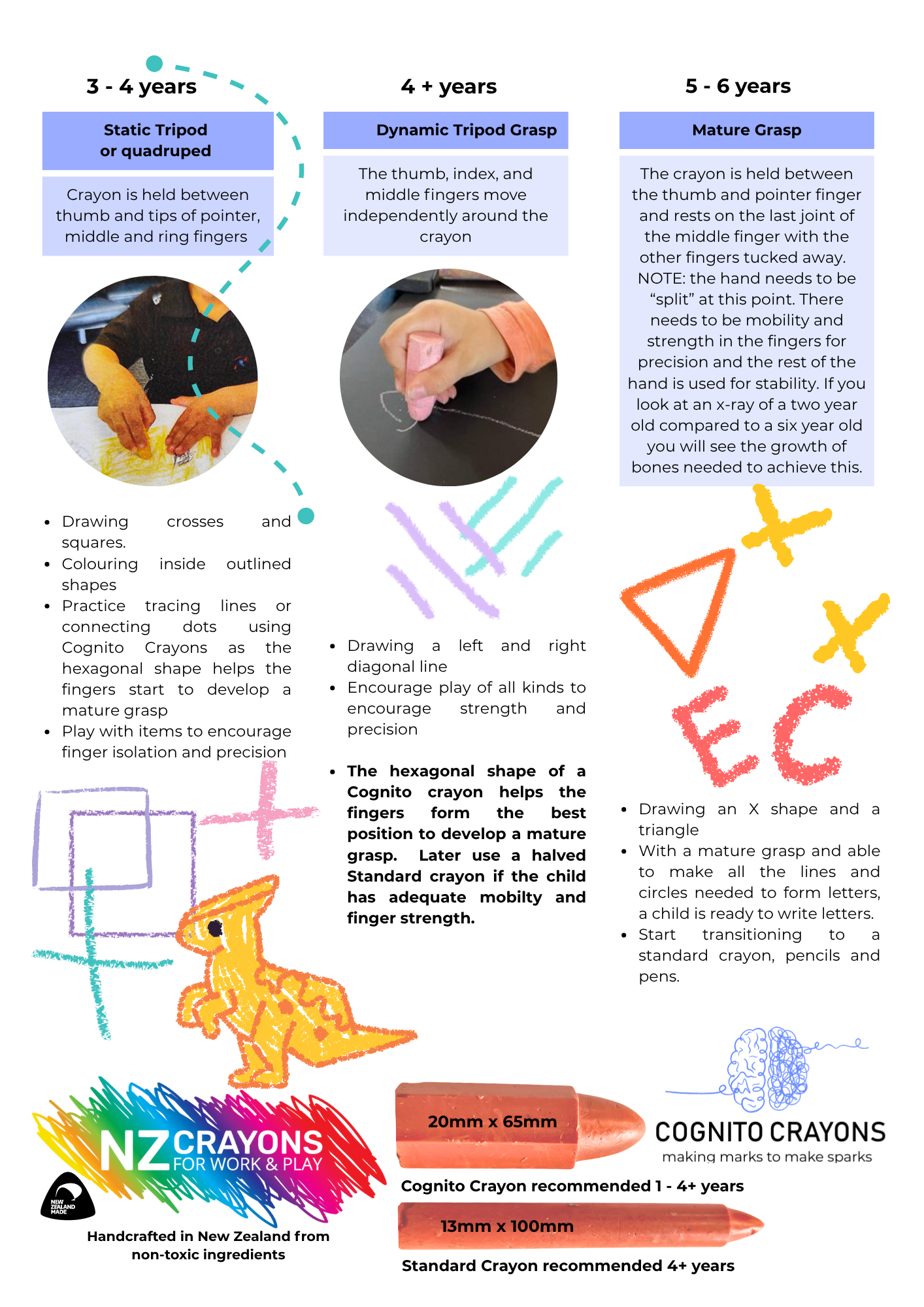 This exciting new range of crayons allows small hands to develop the strength and skills to start to draw and write. They won't break or roll off the table. Like all our crayons they are non toxic and handmade right here in New Zealand. 20mm x 65mm