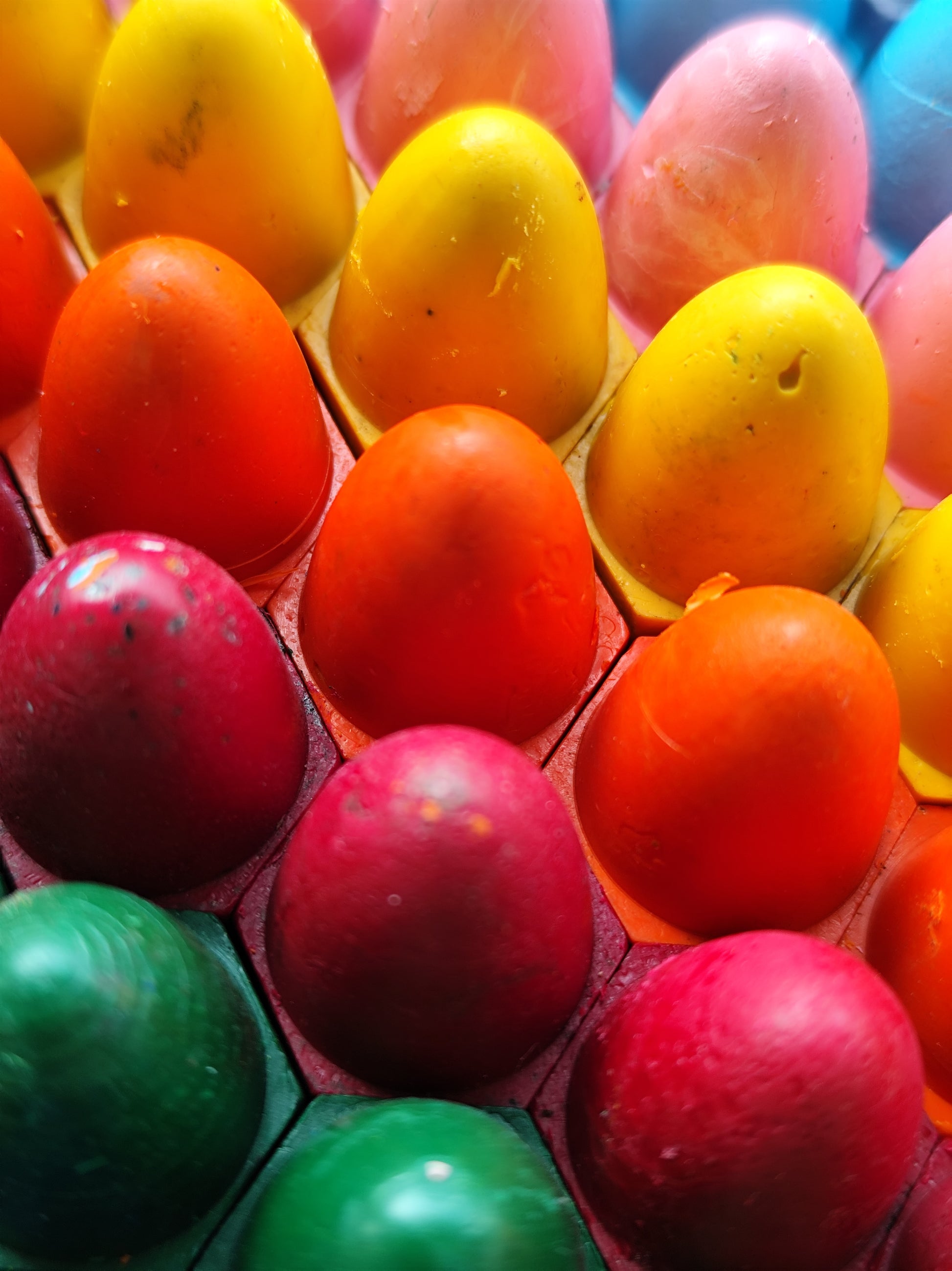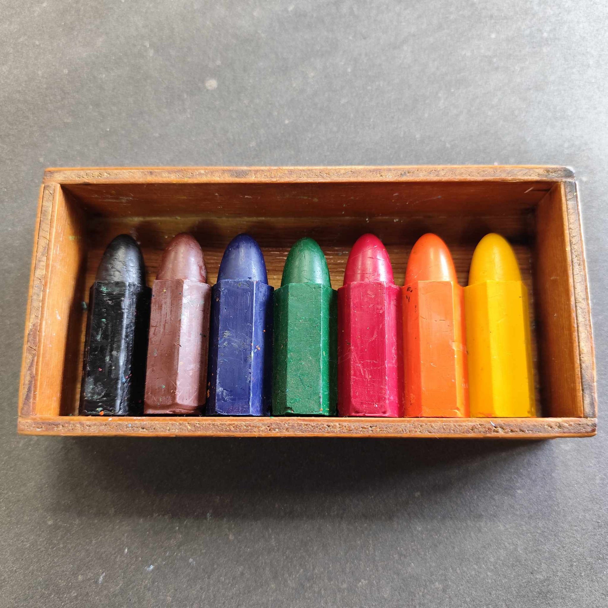 Bulk box : 77 crayons. 7 of each of the following colours: black, brown, blue, green, red, orange, yellow, lilac, light blue and white.